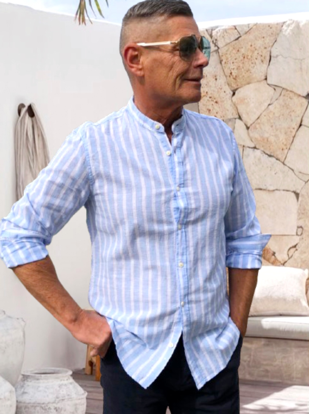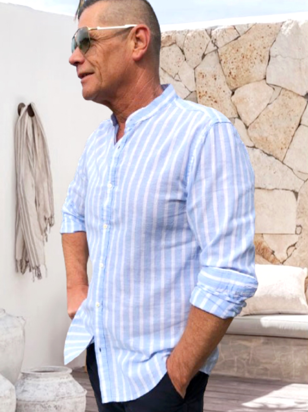 SANTIAGO csÍkos FÉRFI LENVÁSZON ING *sky blu*